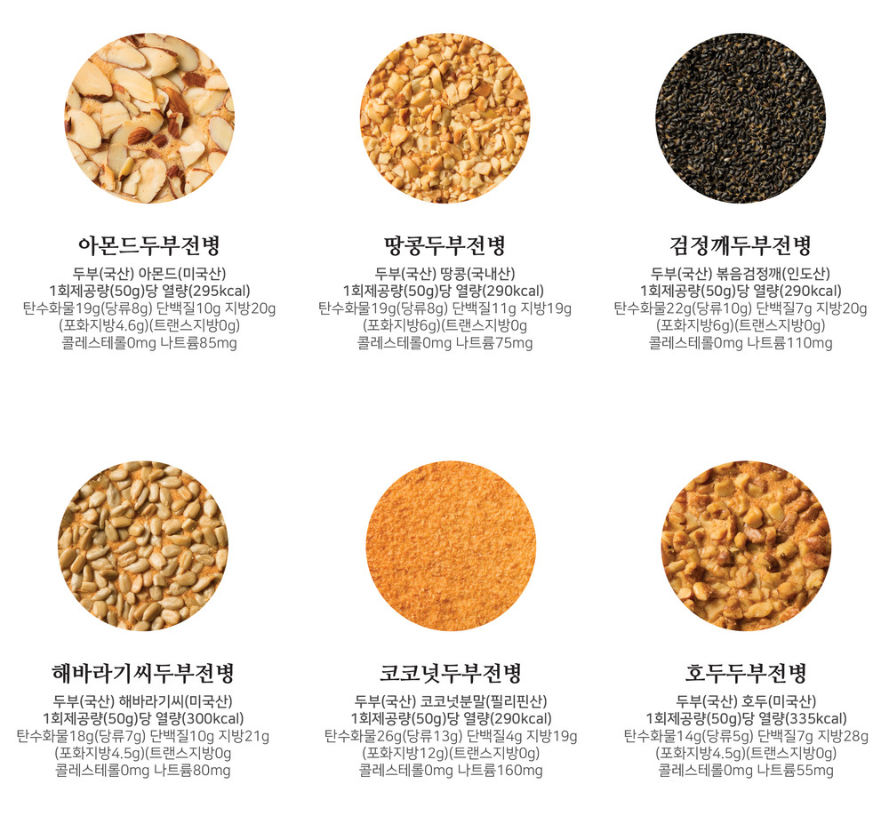아몬드, 땅콩, 코코넛, 해바라기씨, 검정깨, 호두 총 6가지 수제전병 영양성분