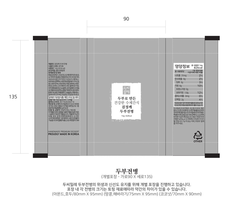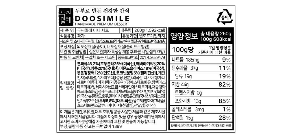 두씨밀레 미니세트는 아몬드, 땅콩, 코코넛, 해바라기씨, 검정깨, 호두 6가지의 수제전병이 각 2개씩 총 12개입으로 구성되어있는 세트로 두씨밀레 두부전병의 모든 맛을 즐기실 수 있습니다.